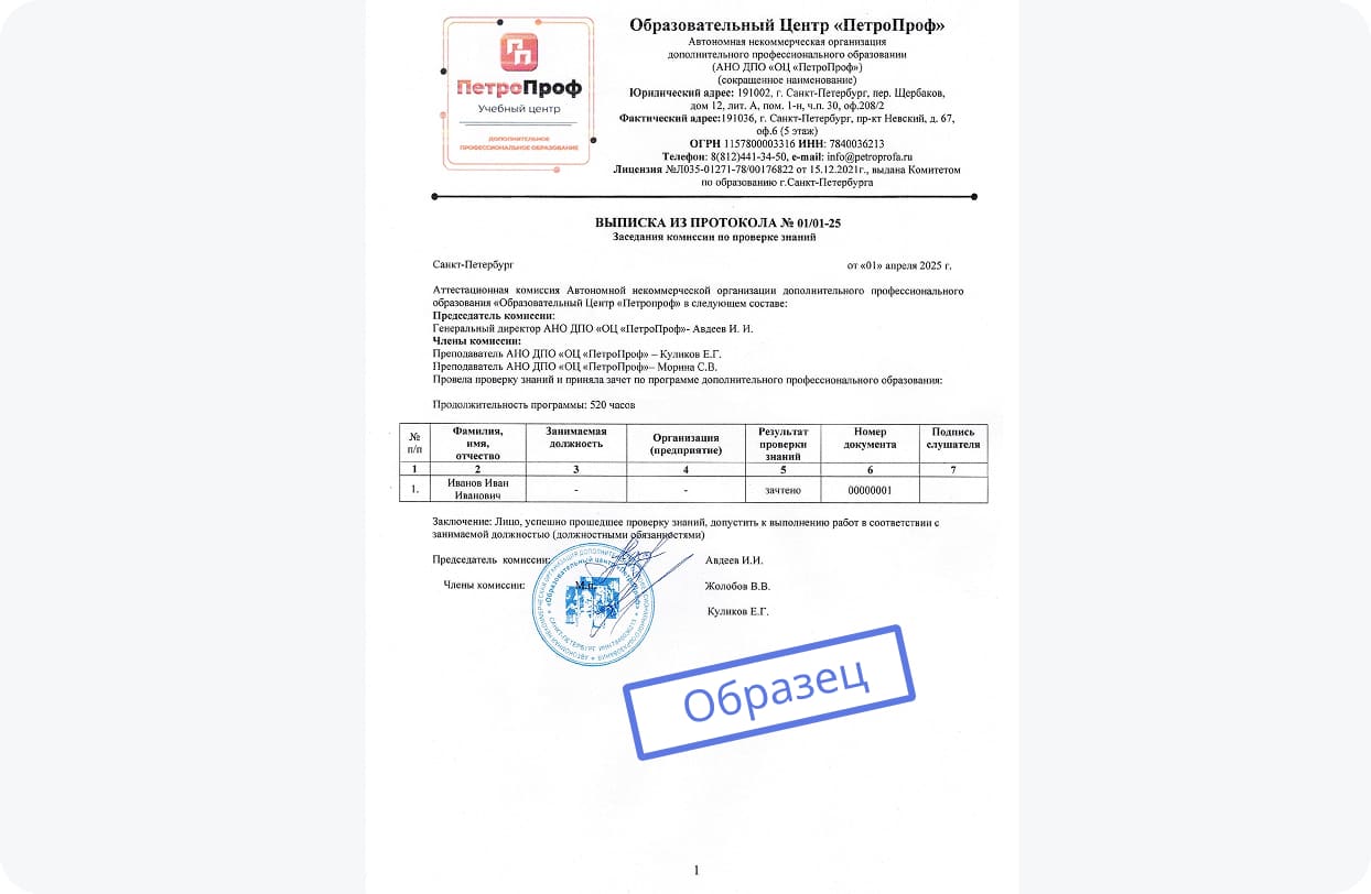 В нем содержится вся важная информация об учебном центре. Тут указываются данные ученика и преподавателей, модули программы обучения и результаты итоговой аттестации. Этот документ юридически подтверждает и закрепляет прохождение слушателями обучения по определенной программе. Выдается на бумажном носителе и в электронном виде. Также все данные, указанные в протоколе, передаются в реестр Минтруда.